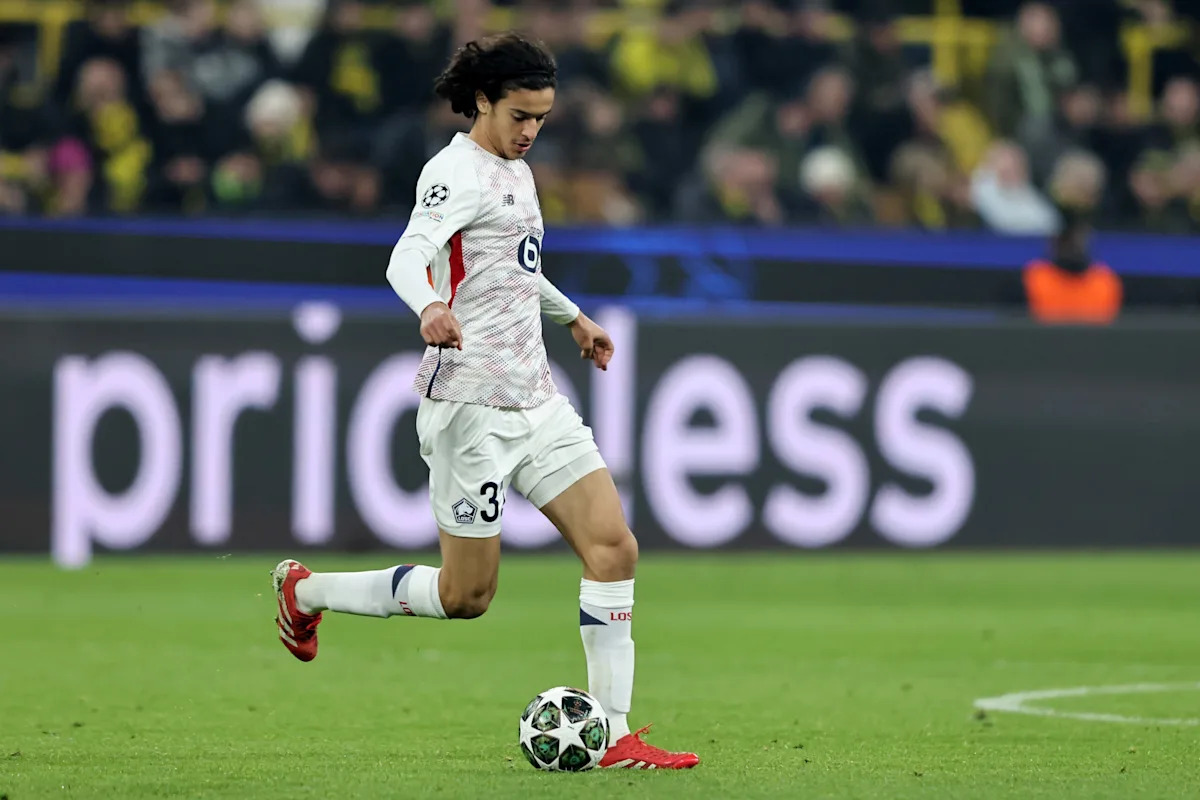 DORTMUND, GERMANY – MARCH 04: Ayyoub Bouaddi of Lille runs with the ball during the UEFA Champions League 2024/25 Round of 16 first leg match between Borussia Dortmund and LOSC Lille on March 04, 2025, in Dortmund, Germany. (Photo by Christof Koepsel/Getty Images)
