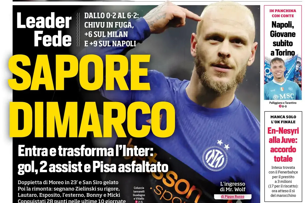 From a 0-2 deficit to a 6-2 triumph: Chivu’s squad moves up with a +6 lead over Milan and +9 over Napoli.